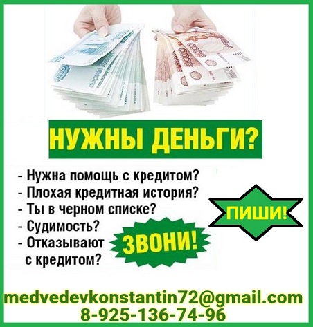 Работаю только со своим одним банком.Суммы от 300 тысяч до 5 миллионов рублей, без залога.Под залог возможны суммы до 50 миллионов рублей.Просьба писать на электронную почту.